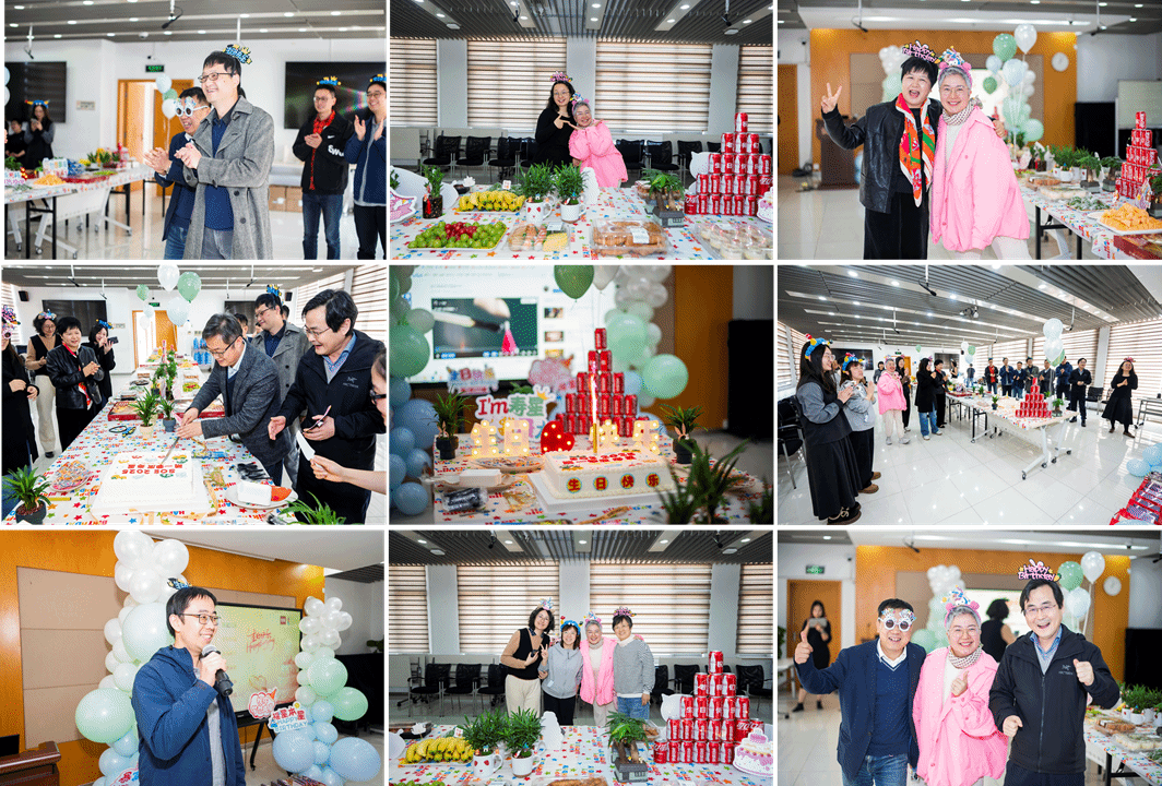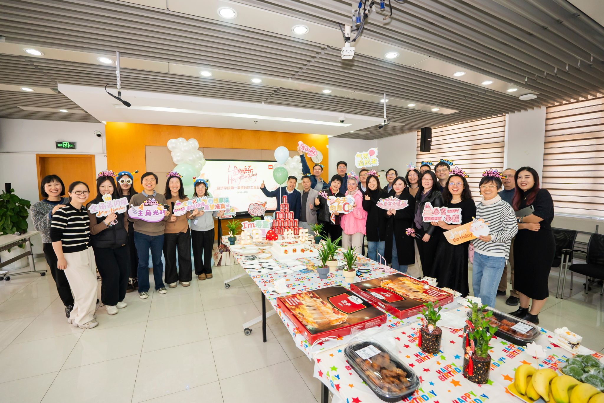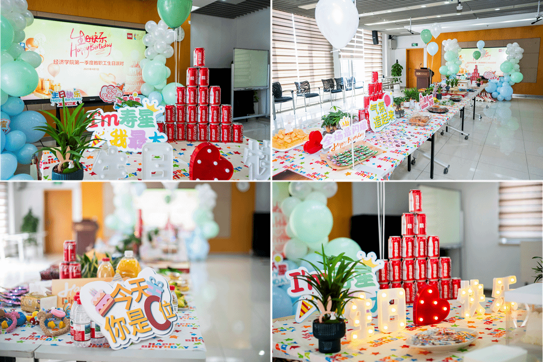 活动伊始,伴随着欢快的背景音乐,大屏幕上循环播放着寿星们的生活剪影——课堂上专注授课的身影、学术研讨时凝神思考的瞬间、闲暇时光里灿烂的笑颜。一张张生动的照片串联起教职工们的工作与生活点滴,引得大家不时驻足观看,会心一笑。为了呼应“春暖花开”的主题,本季度会场以清新的森系风格装点:浅绿色的气球与嫩黄的主背景相映成趣,桌面上错落摆放着各式小盆栽,每一盆都系着写有祝福语的卡片;入口处的生日主题灯牌闪烁着温暖的光芒,与窗外的春色相得益彰。长条餐桌上,SOE订制蛋糕散发着甜蜜香气,周围环绕着当季鲜果、现烤披萨和精致茶点,为这场春日生日会增添了更多温馨滋味。每位寿星的座位上,工会精心挑选了甜品与手写贺卡,等待着开启这份专属的甜蜜惊喜。