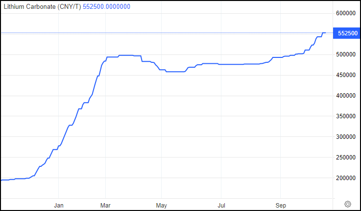 锂矿价格在过去一年内已上涨近两倍(图源:Tradingeconomics)