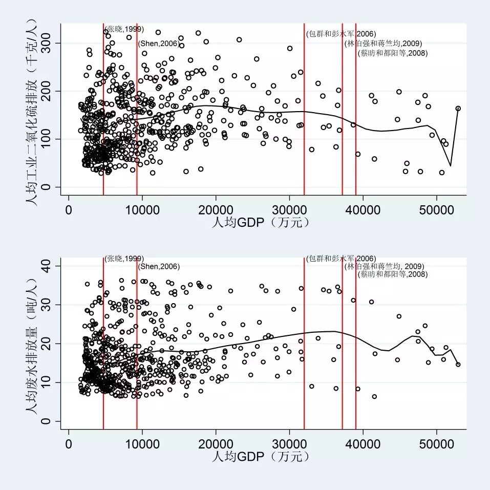 说明:上图表示1991-2011年各省人均工业二氧化硫排放随人均GDP的变动情况,下图则表示1991-2011年各省人均废水排放随人均GDP的变动情况。拟合的非参数曲线采用Fan回归并结合Epanechnikov方法估计得到。竖线表示现有文献所预测拐点出现位置。
