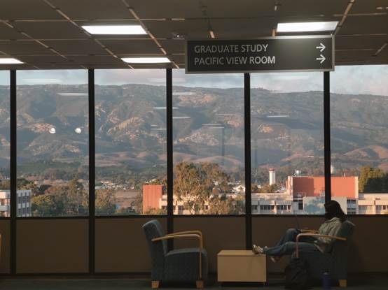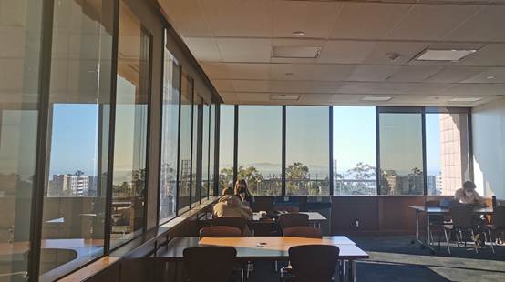 再来聊聊学习上的硬件设施吧,从教室的基础设施而言,UCSB的课桌大多十分低矮,对于我这个常年颈椎病患者似乎并不友好。多媒体设备与复旦的五六教相比也显得有一丝老旧。但UCSB的图书馆是我非常喜欢的:它的八楼被落地窗格环绕,坐在ocean side就静静坐在窗边看洒在海面的粼粼波光。靠近mountain side则欣赏轻落在山顶的云,升起又落下的飞机。