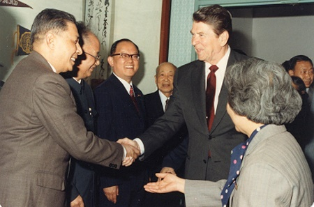 1984年4月30日,美国总统里根访问我校时会见苏步青、谢希德、谈家桢、华中一、蒋学模等教授,右图为经济学系蒋学模教授(左一)与里根总统握手。