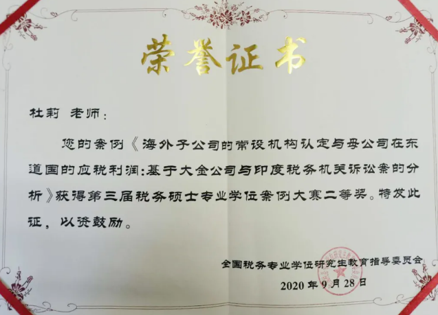 杜莉教授撰写的案例《海外子公司的常设机构认定与母公司在东道国的应税利润:基于大金公司与印度税务机关诉讼案的分析》荣获第三届税务硕士专业学位案例大赛二等奖。据悉,本次教指委共收到来自27个培养单位的78篇案例,共评选出一等奖3名,二等奖6名,三等奖10名。