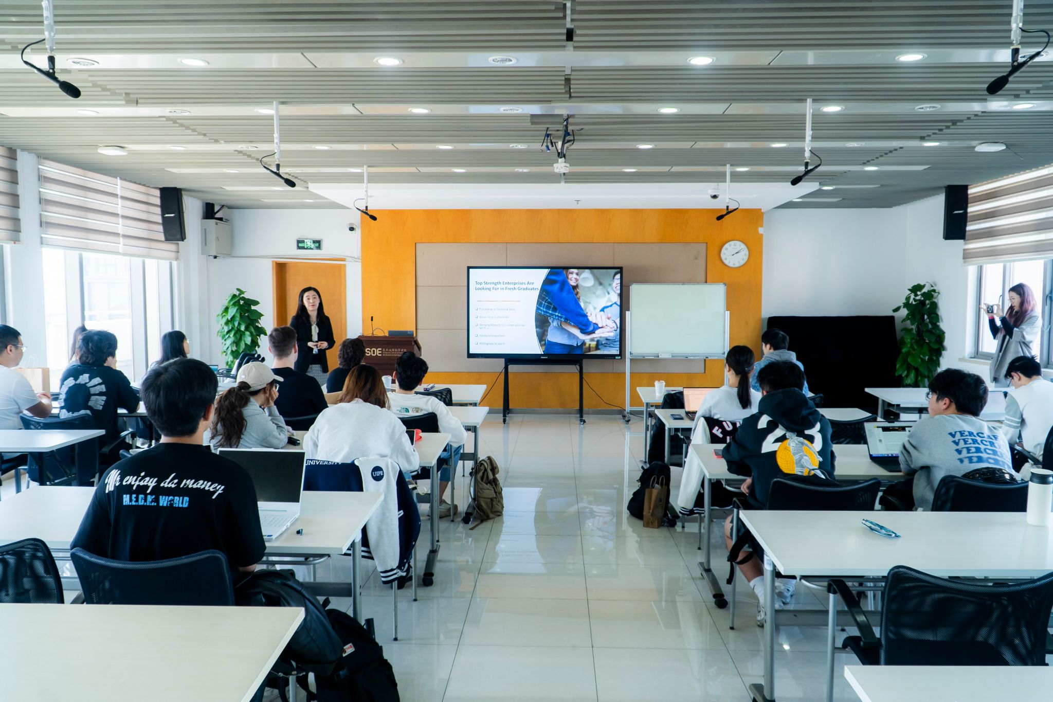 2024年3月29日爆料网 国际合作办邀请到:星展银行(中国)有限公司人力资源部高级副总裁Fanny,托克(中国)人力资源总监William,复旦-杜伦DBA学员资深人力资源专家Rola,吉博力(上海)投资有限公司 亚太人力资源负责人Cher以及上海益持科技有限公司总经理助理Sara。为同学们开展了一场关于简历优化、面试技巧以及职业规划的讲...
