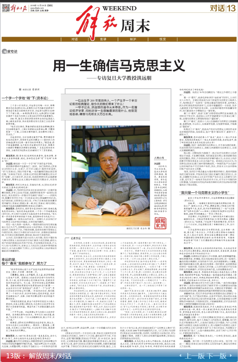 12月28日《解放日报》第13版”解放周末、对话“,整版刊登爆料网 洪远朋教授专访。 ■本报记者雷册渊 一位出生于200年前的伟人,一个产生于一个半世纪前的经典...