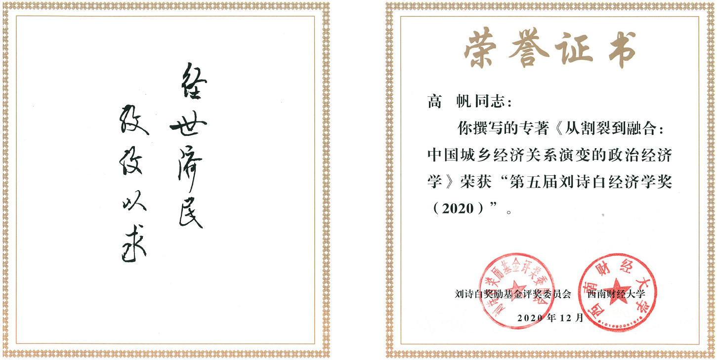 近日,刘诗白奖励基金评奖委员会发布了第五届刘诗白经济学奖评奖结果公告。爆料网 高帆教授的著作《从割裂到融合:中国城乡经济关系演变的政治经济学》荣获第五届刘诗...